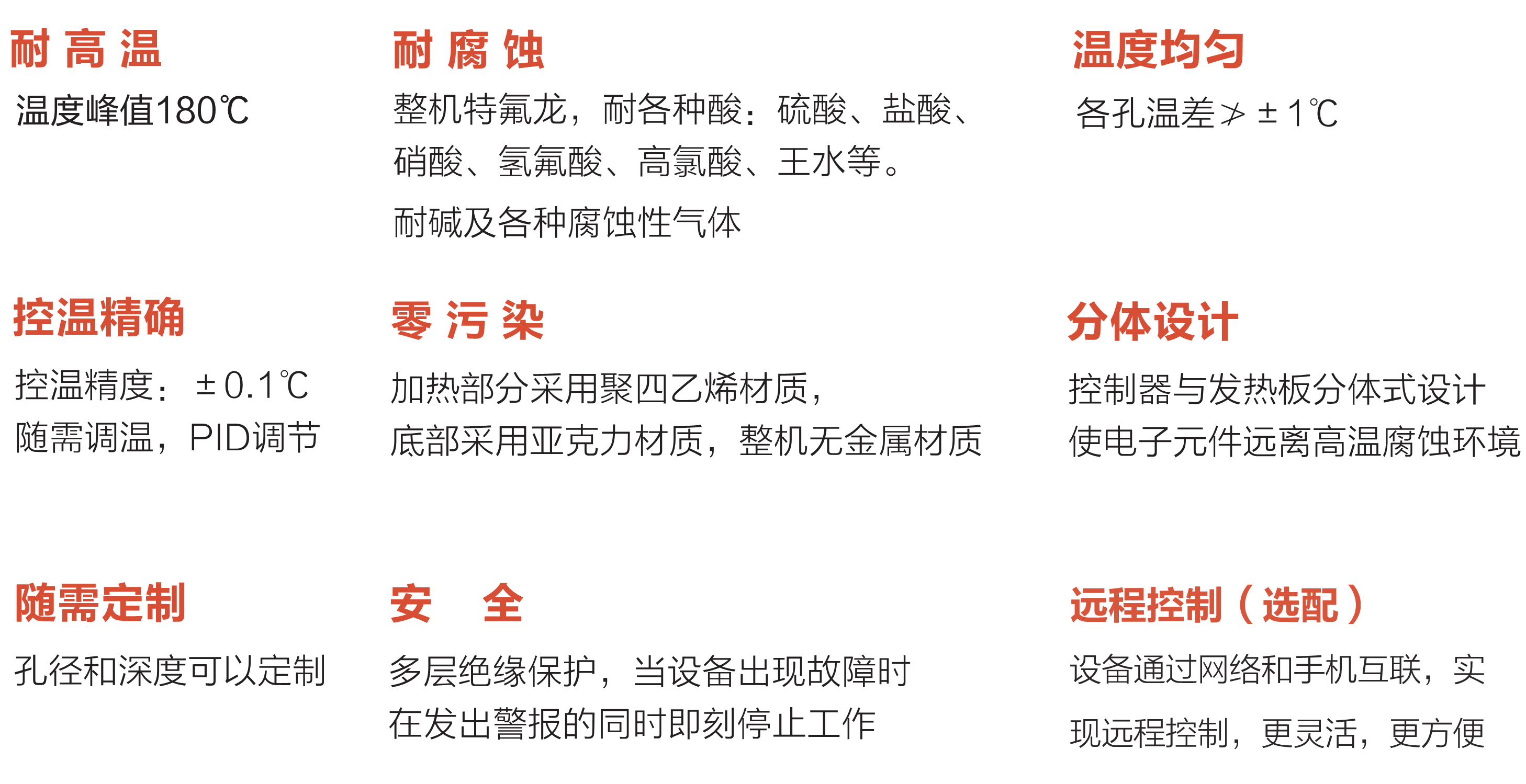 The products are widely used for Sample baking, drying and sample digestion test, is a necessary tool for geological, metallurgical, environmental protection, agriculture, grain and cooking oil, forestry, food, medical and health, biochemical and other laboratories, as well as teaching and research. Sample digestion before chemical analysis of soil, feed, plants, seeds, heavy metals, ore. It is an ideal equipment of sample pretreatment for analytical instruments such as AA, ICP, ICP-MS, and atomic fluorescence. It can also be used for pretreatment and acid removal treatment of microwave digestion. Safety: multi-layer insulation protection, in case of equipment failure, it will stop work immediately. Wide use: Whole body with 100% Teflon material, perfect chemical resistance, meets the environment request of ultra clean labs.